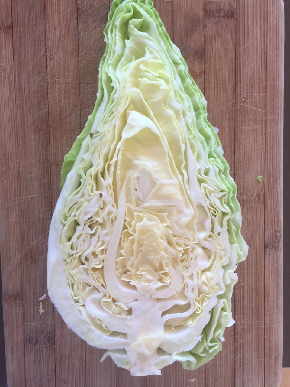 2-peel any loose green leaves off the cabbage so you just have the tight heart. Slice the cabbage into 6 wedges, keeping the bases intact. Rinse them.