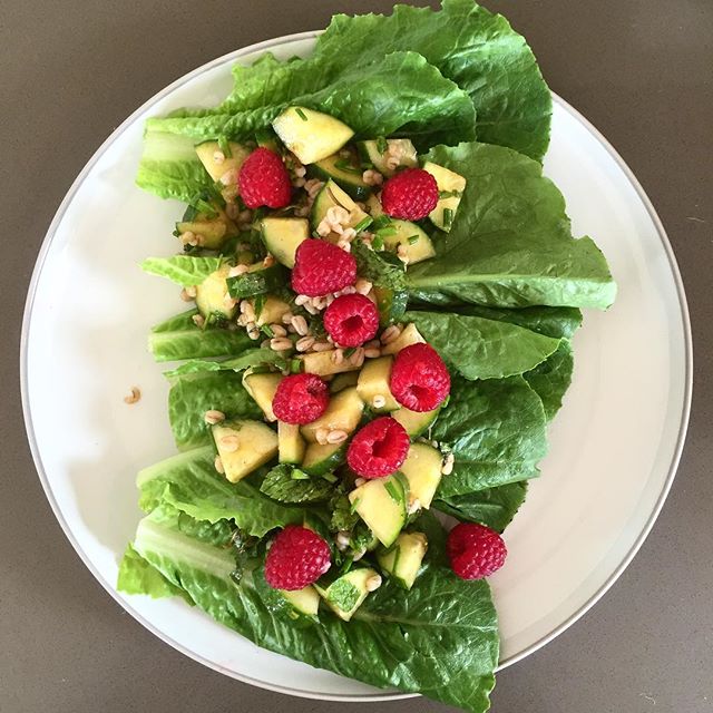 4. Pile the pearl barley salad onto your bed of lettuce leaves. Dot the raspberries over the top.